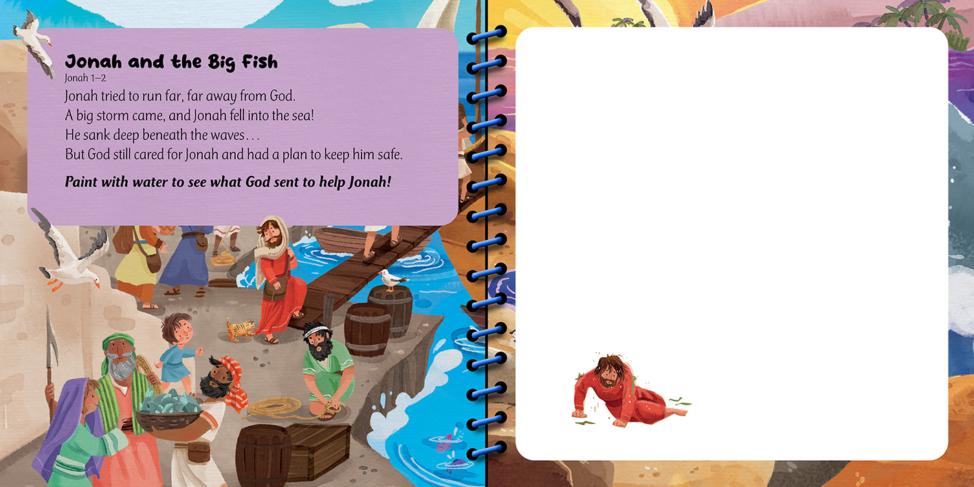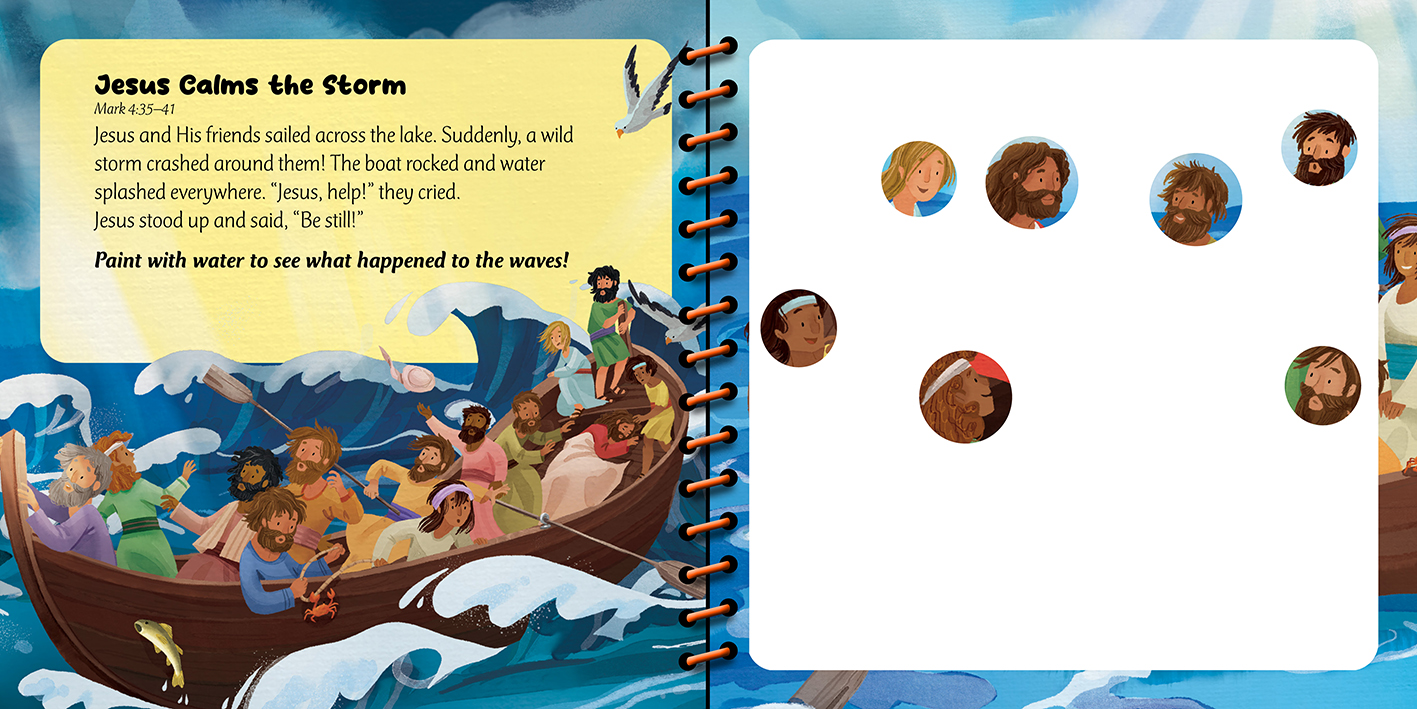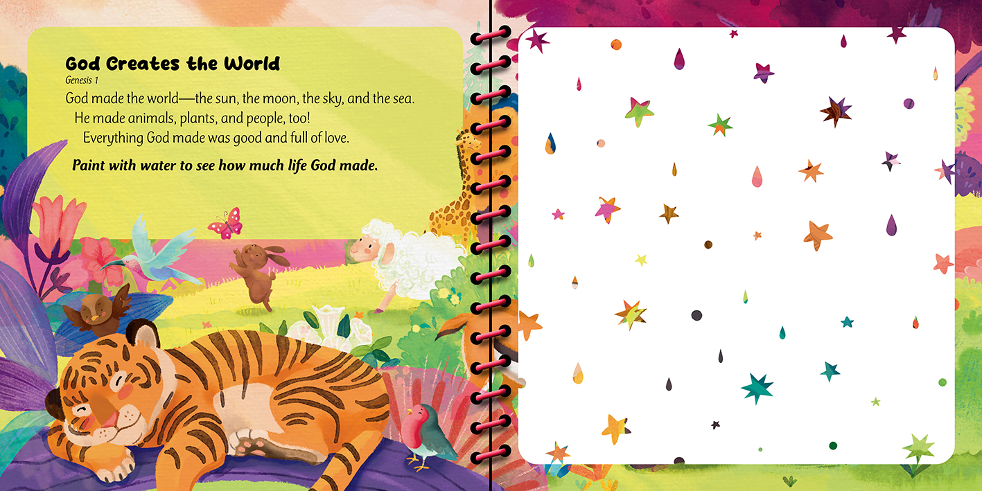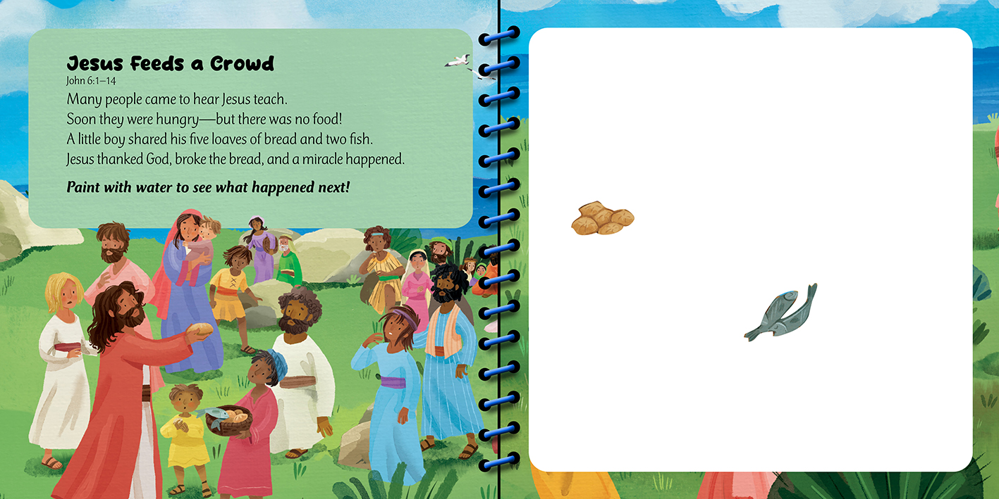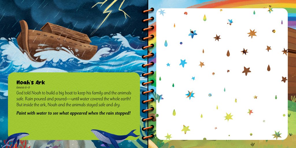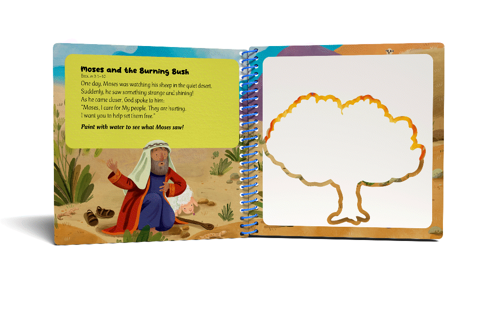 Each book includes five short Bible stories paired with interactive paint-with-water scenes that help children explore God’s Word through play.